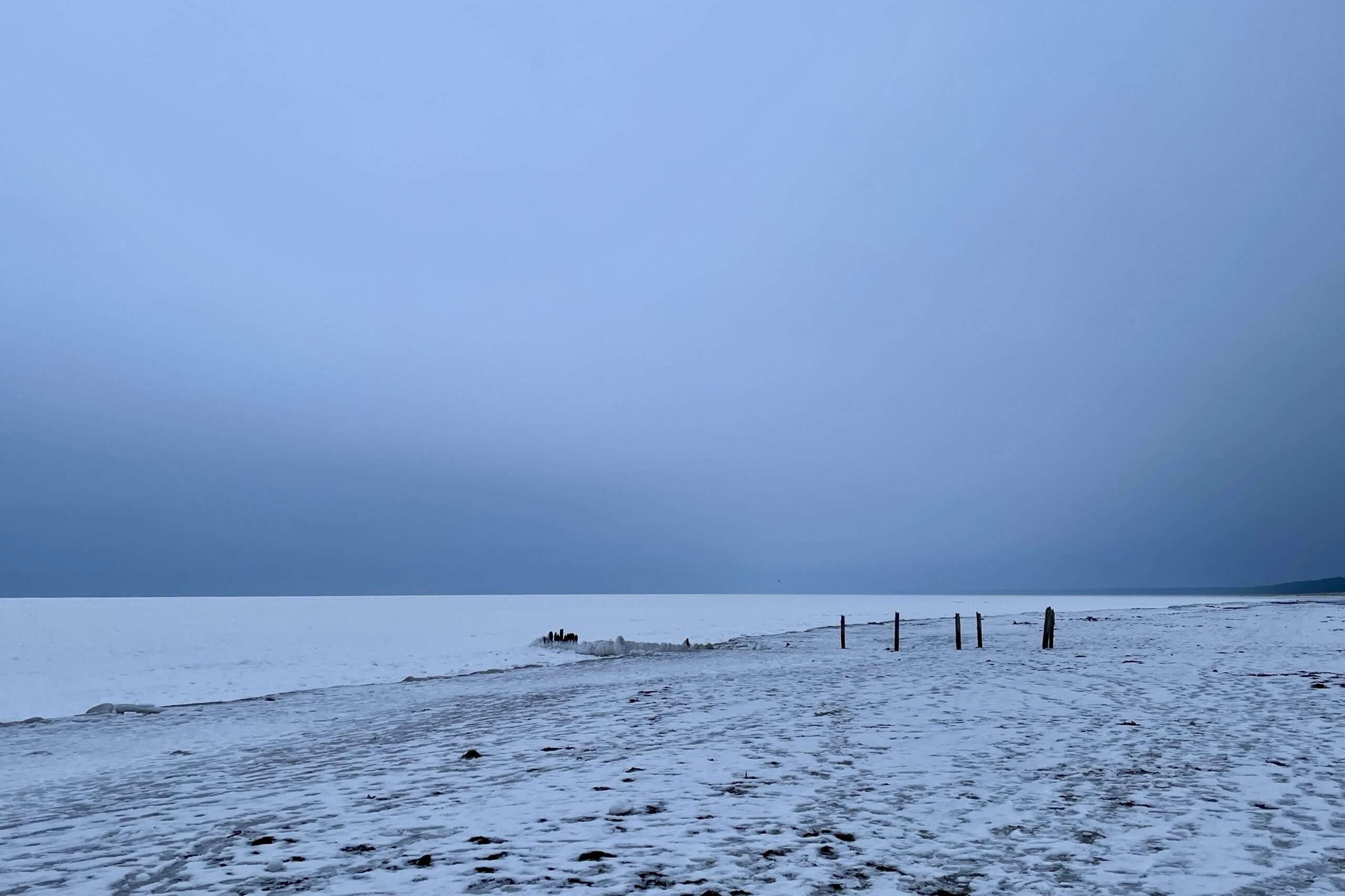 Zwischen zugefrorener Ostsee und verschneitem Dünenwald gibt es Strand mit Schnee.