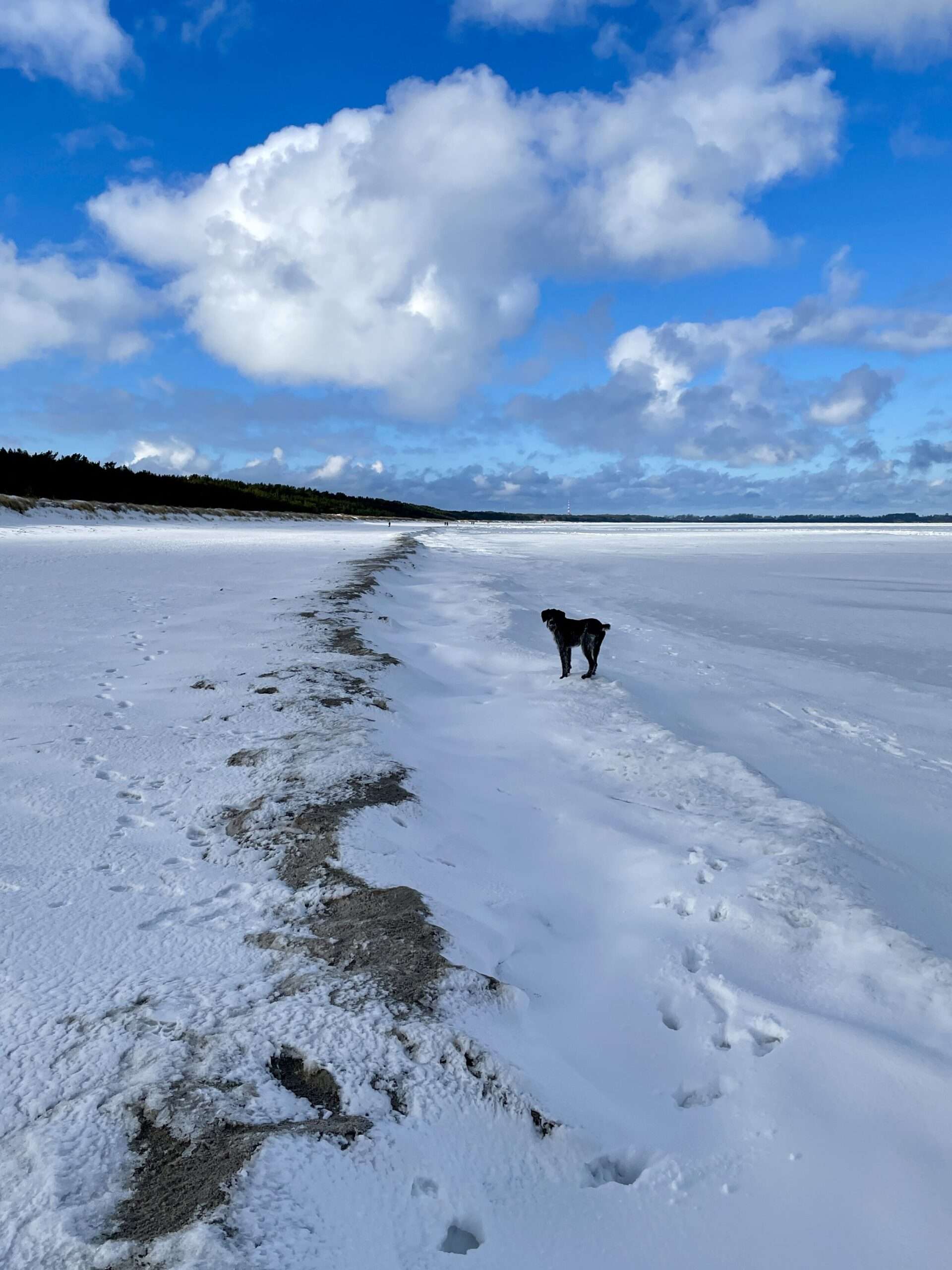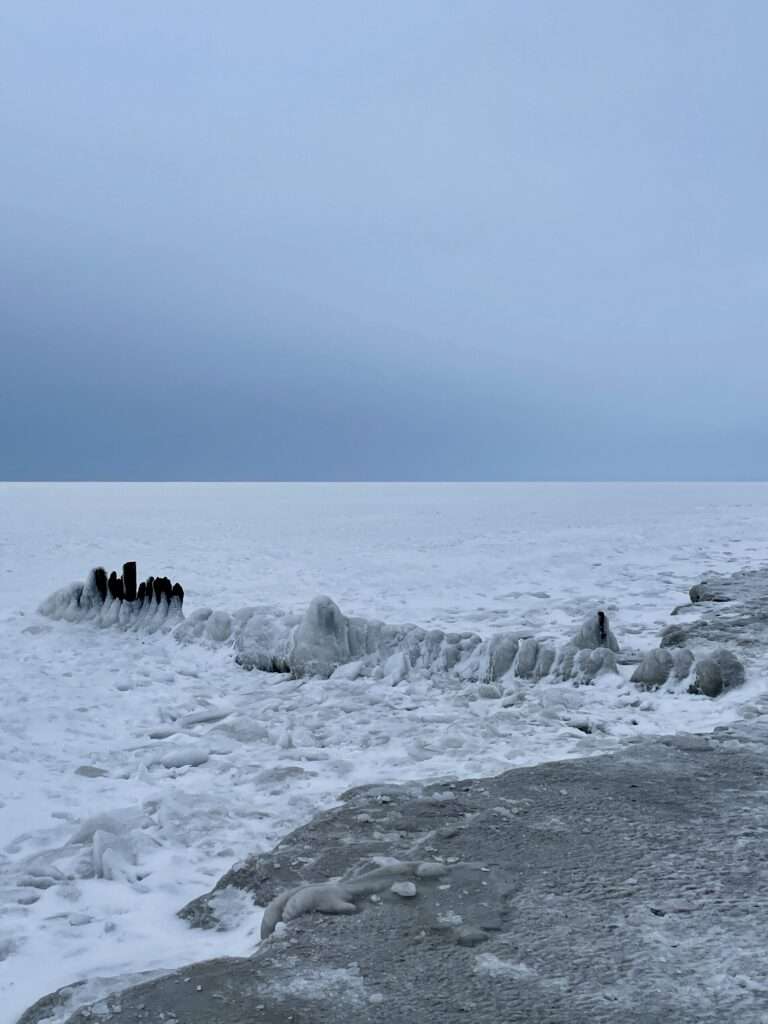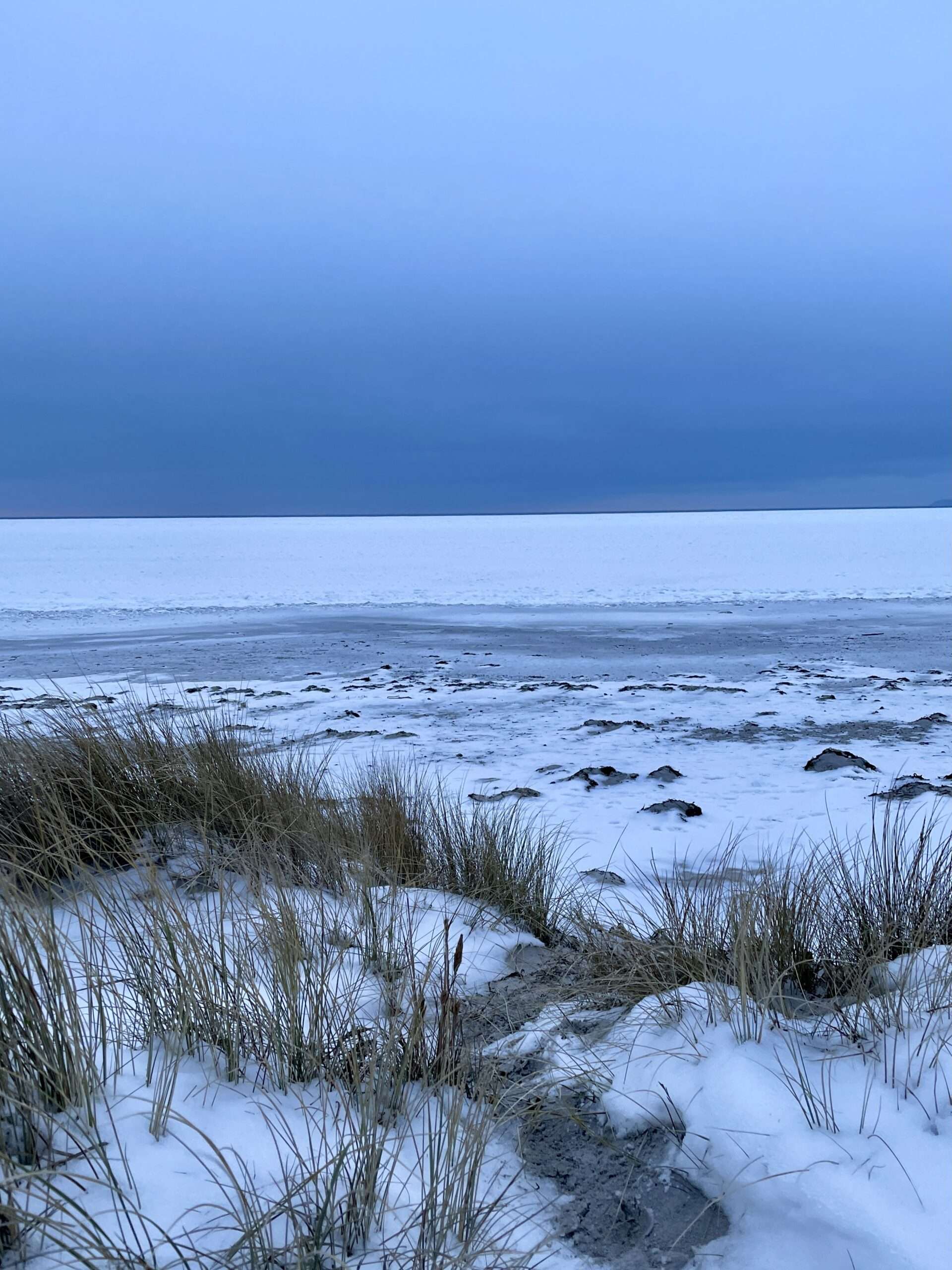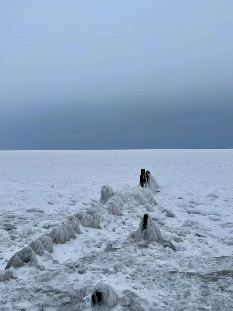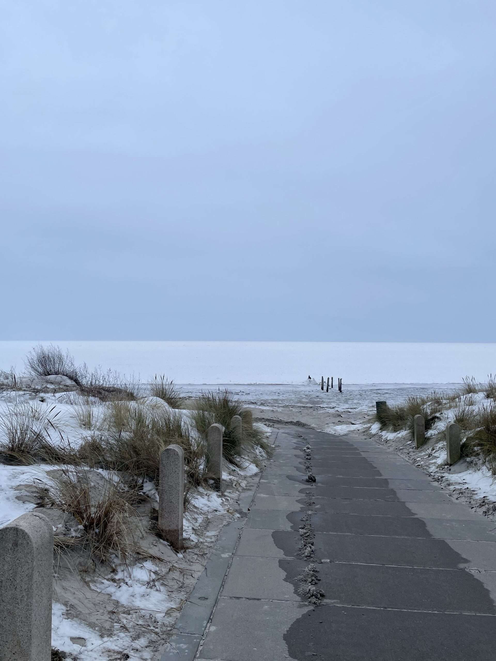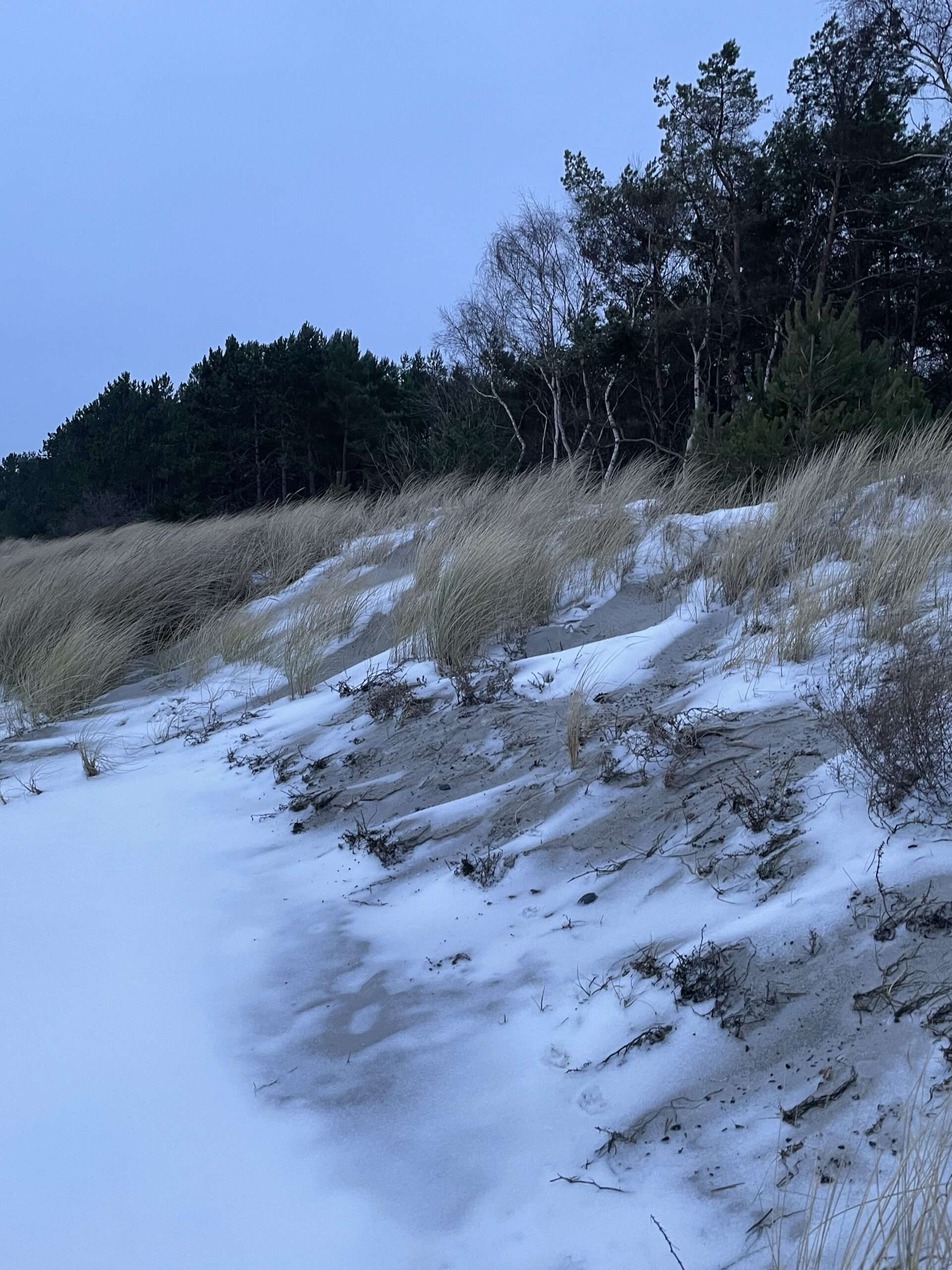 Und dann friert die Ostsee zu. Das erste Mal seit vielen Jahren. Wir kommen Ende Januar an, und es ist sofort klar: Das hier ist kein milder Küstenwinter, kein freundliches Durchatmen, nix da mit gemütlich am Strand flanieren bei Februarsonne. Mit dem Wind fühlen sich die -9°C eher an wie -19°C. Das sagt zumindest die Wetterapp. Ich kann das nur bestätigen, denn sobald man über die Dünen kommt, verschlägt es einem den Atem mit einem Gemisch aus scharfen Sandkörnchen und zeckenden Eisflocken. Ich weiß nicht, ob dieses unfreiwillige Peeling gesund ist.