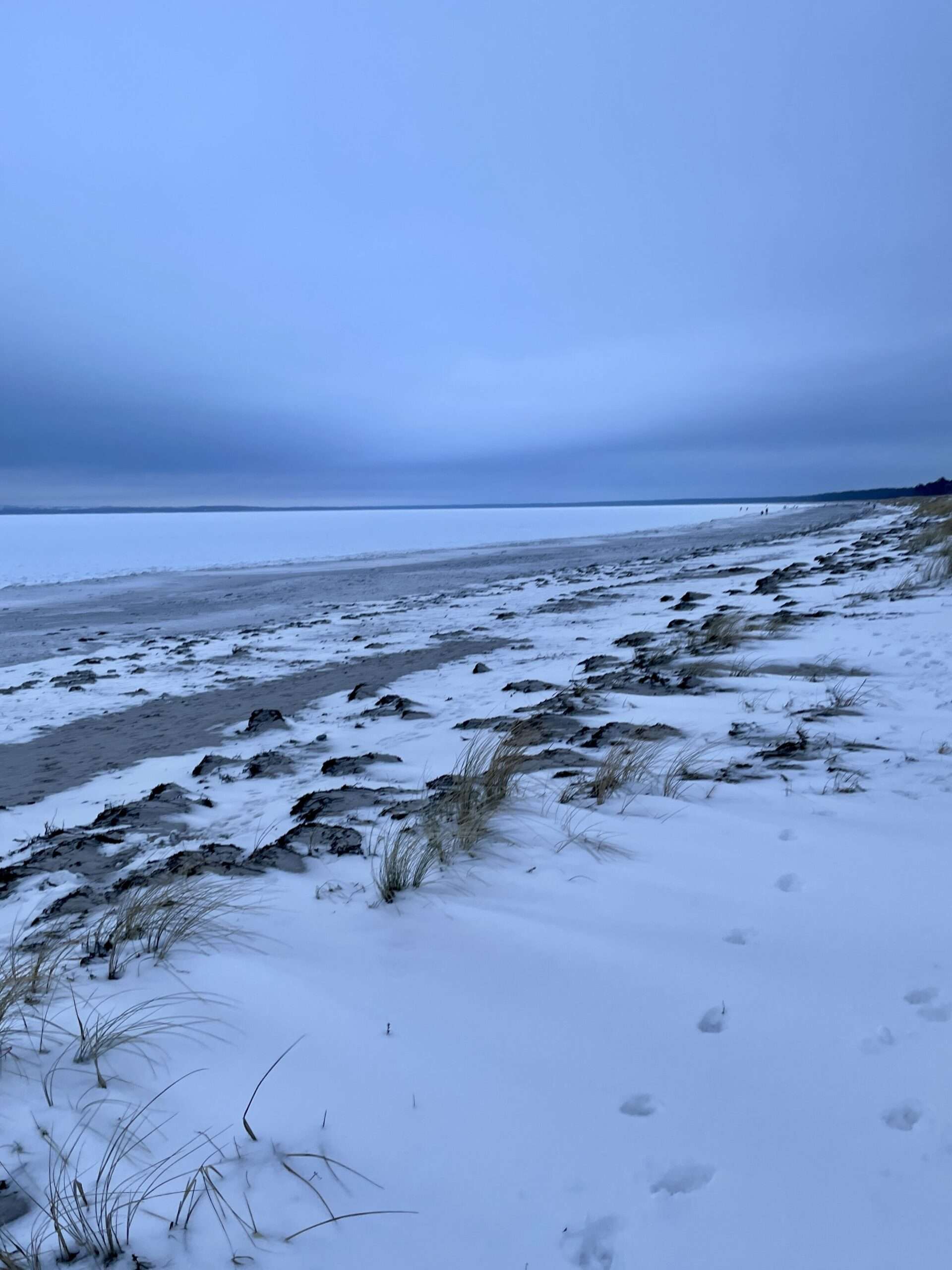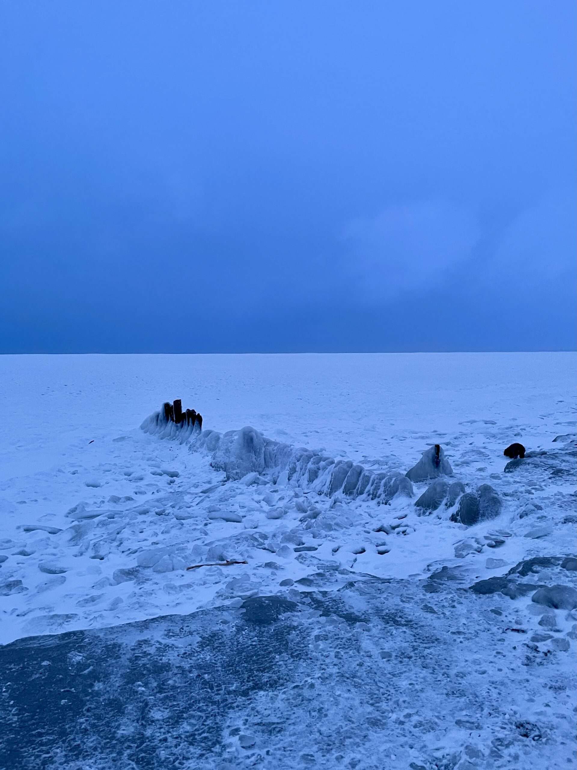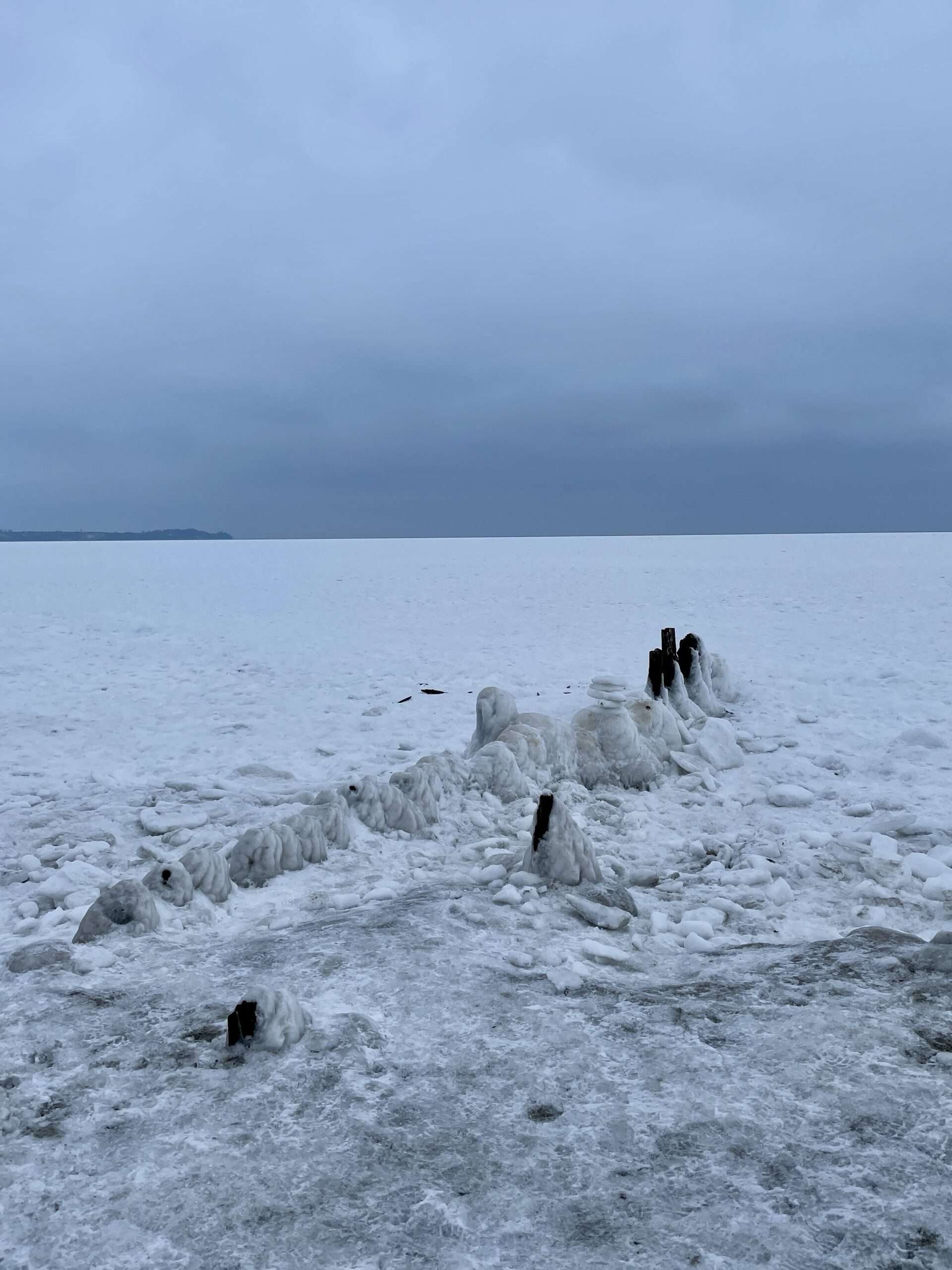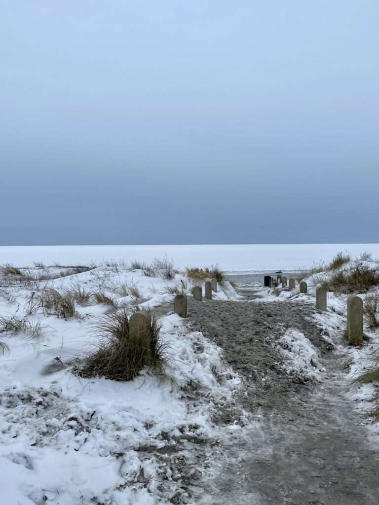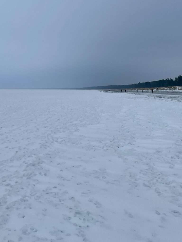 Und dann friert die Ostsee zu. Das erste Mal seit vielen Jahren. Wir kommen Ende Januar an, und es ist sofort klar: Das hier ist kein milder Küstenwinter, kein freundliches Durchatmen, nix da mit gemütlich am Strand flanieren bei Februarsonne. Mit dem Wind fühlen sich die -9°C eher an wie -19°C. Das sagt zumindest die Wetterapp. Ich kann das nur bestätigen, denn sobald man über die Dünen kommt, verschlägt es einem den Atem mit einem Gemisch aus scharfen Sandkörnchen und zeckenden Eisflocken. Ich weiß nicht, ob dieses unfreiwillige Peeling gesund ist.
