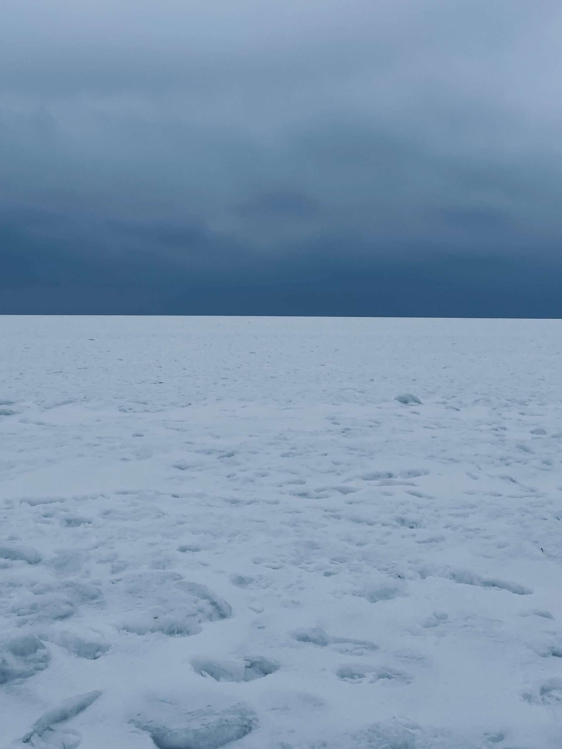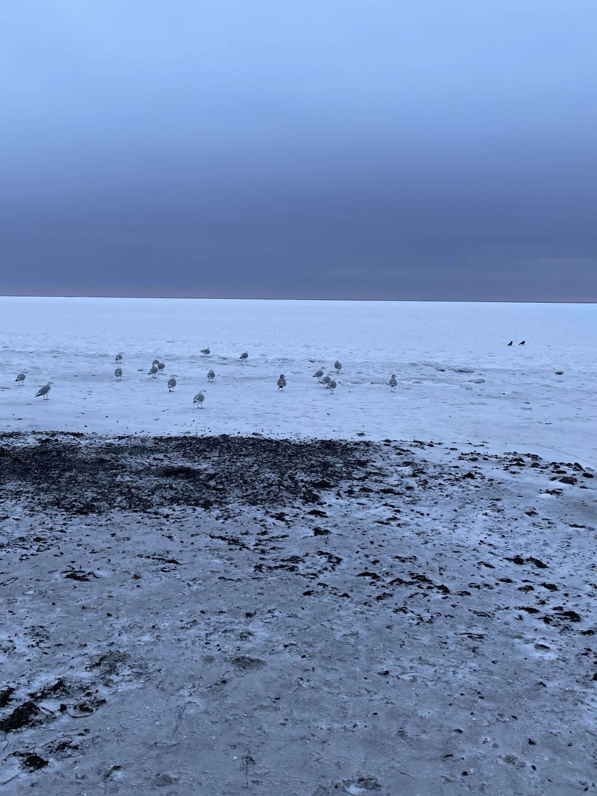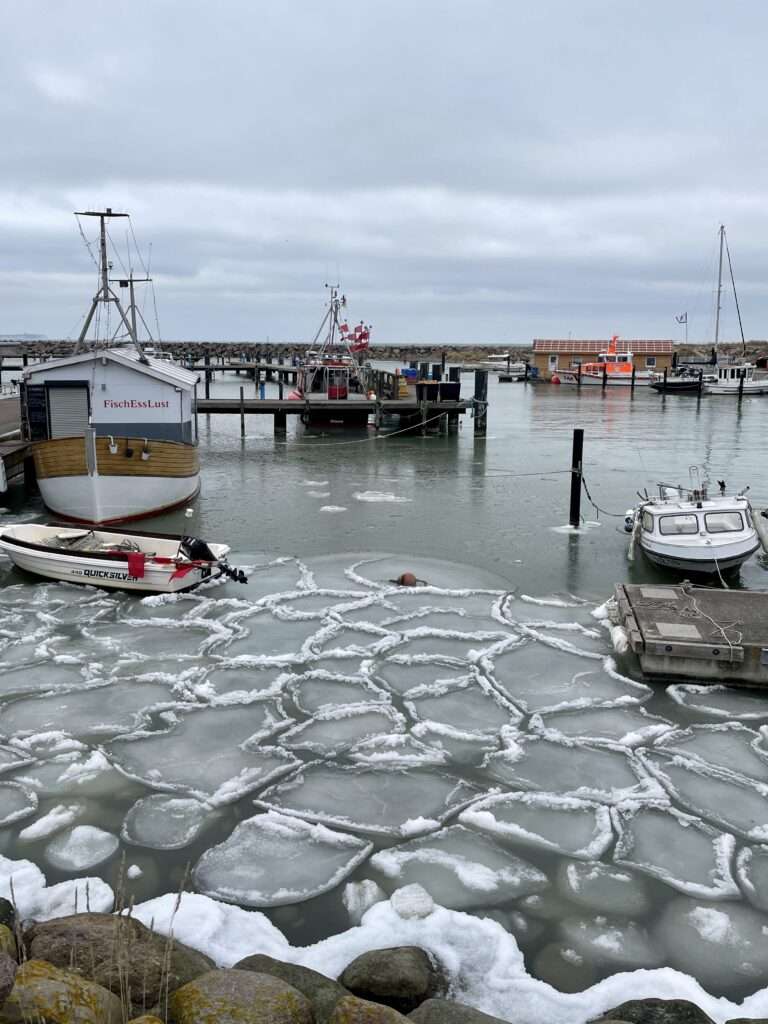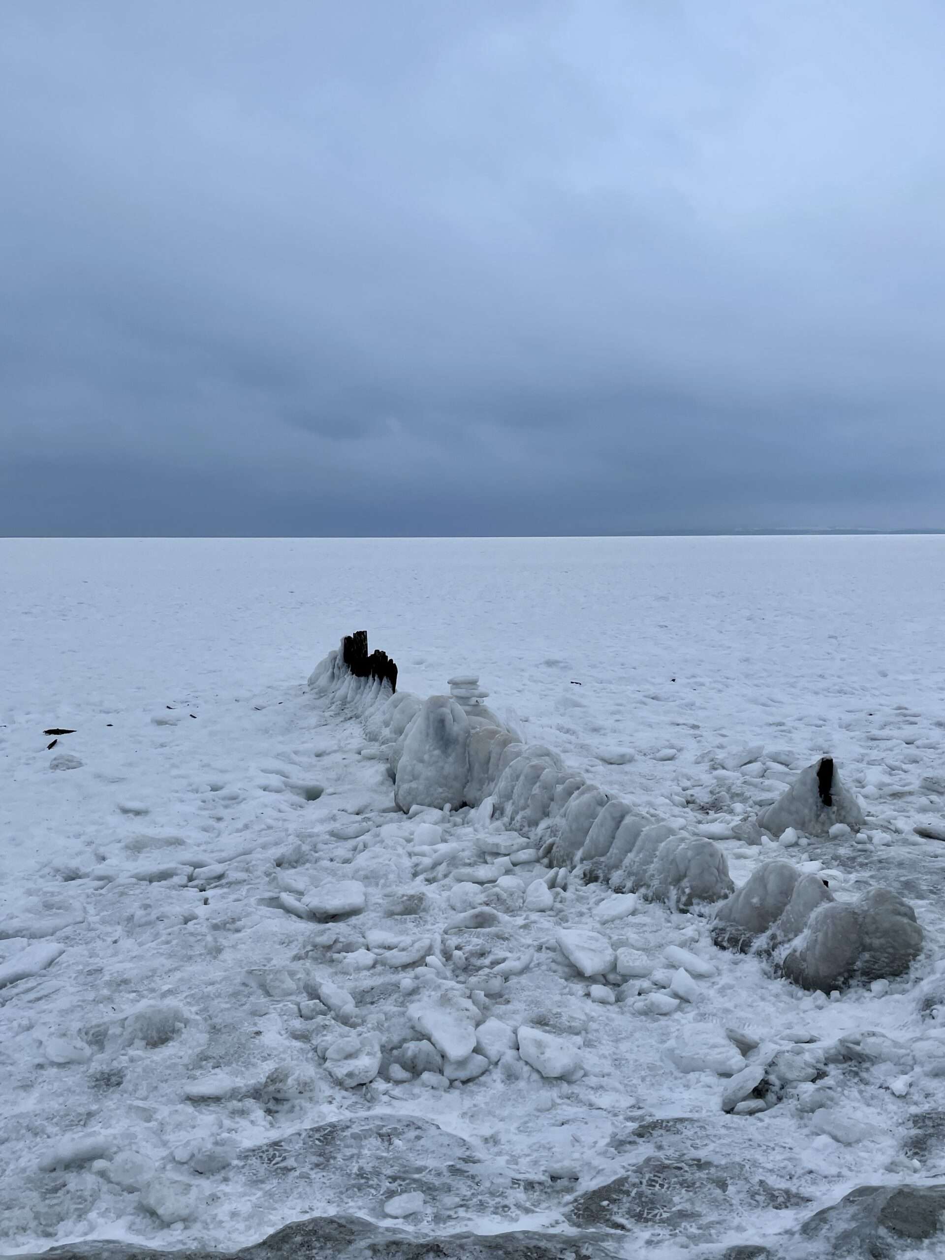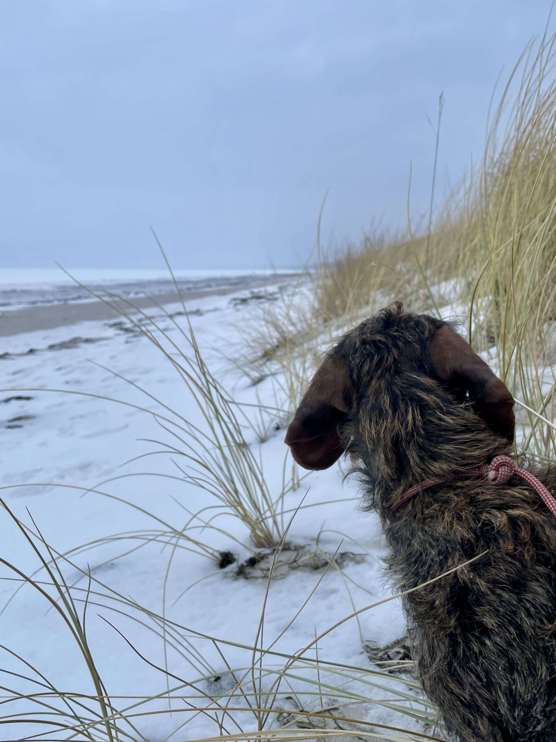 Und dann friert die Ostsee zu. Das erste Mal seit vielen Jahren. Wir kommen Ende Januar an, und es ist sofort klar: Das hier ist kein milder Küstenwinter, kein freundliches Durchatmen, nix da mit gemütlich am Strand flanieren bei Februarsonne. Mit dem Wind fühlen sich die -9°C eher an wie -19°C. Das sagt zumindest die Wetterapp. Ich kann das nur bestätigen, denn sobald man über die Dünen kommt, verschlägt es einem den Atem mit einem Gemisch aus scharfen Sandkörnchen und zeckenden Eisflocken. Ich weiß nicht, ob dieses unfreiwillige Peeling gesund ist.