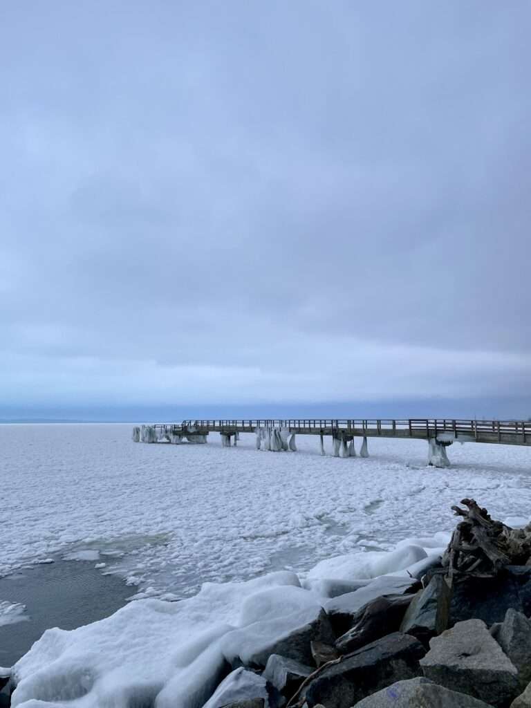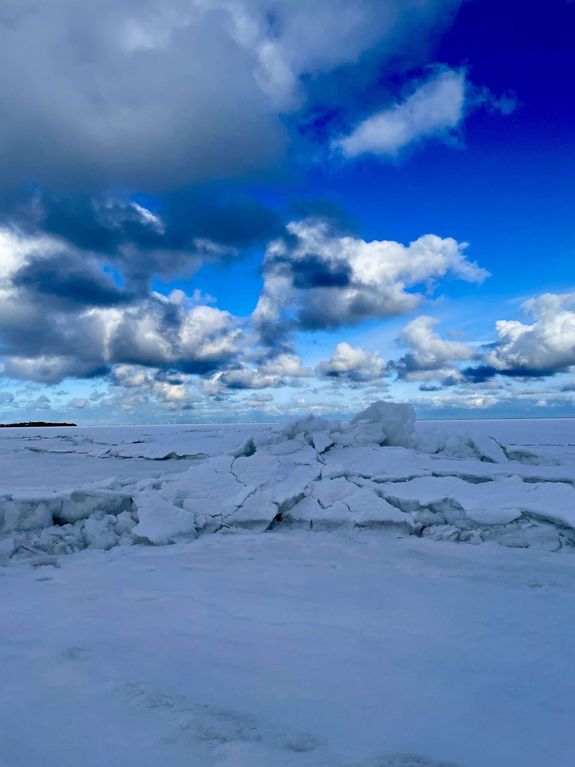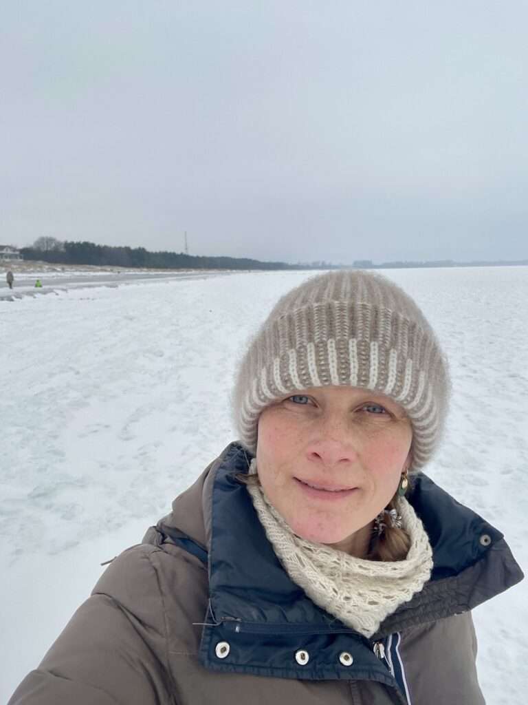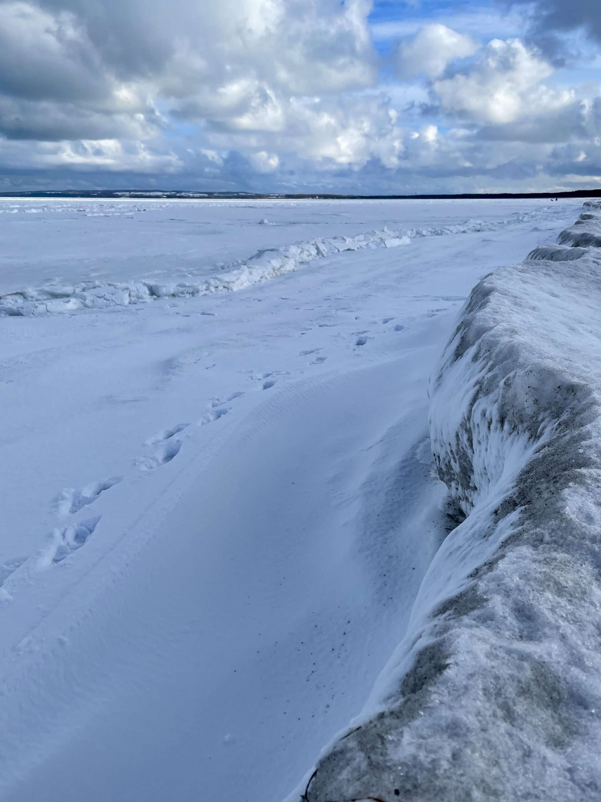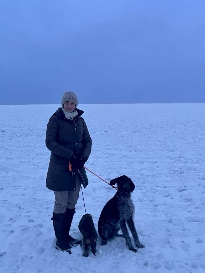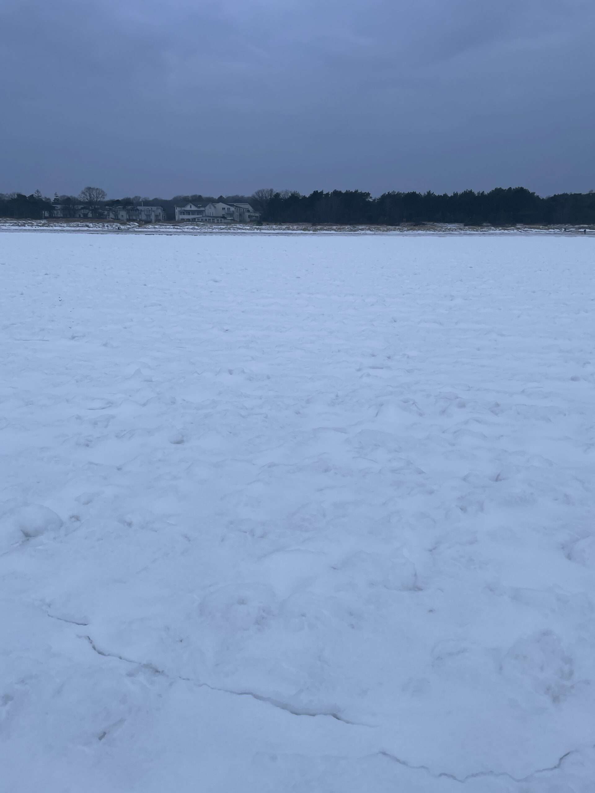 Und dann friert die Ostsee zu. Das erste Mal seit vielen Jahren. Wir kommen Ende Januar an, und es ist sofort klar: Das hier ist kein milder Küstenwinter, kein freundliches Durchatmen, nix da mit gemütlich am Strand flanieren bei Februarsonne. Mit dem Wind fühlen sich die -9°C eher an wie -19°C. Das sagt zumindest die Wetterapp. Ich kann das nur bestätigen, denn sobald man über die Dünen kommt, verschlägt es einem den Atem mit einem Gemisch aus scharfen Sandkörnchen und zeckenden Eisflocken. Ich weiß nicht, ob dieses unfreiwillige Peeling gesund ist.
