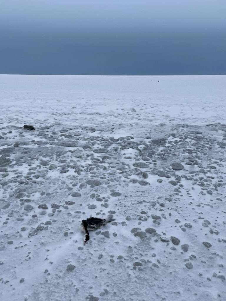 Auch am einst flachen Strand schieben sich Schnee-Eiswasser-Platten zusammen. Hier und da Reste von Vögeln und Fischen, auch als Futter für andere Vögel. (0°C/ -5°C, gefühlt -15°C, scharfer Ostwind)