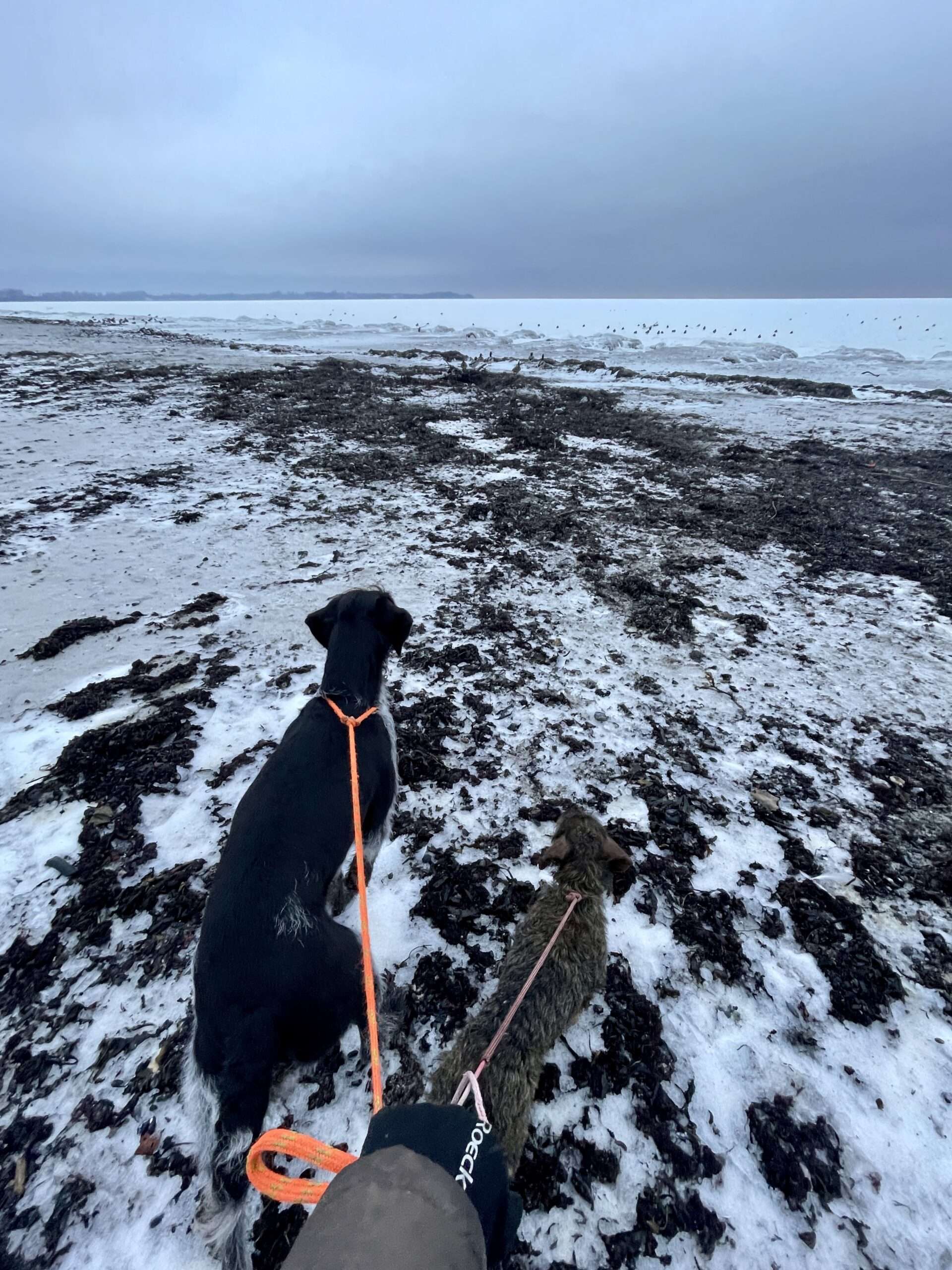 Verglichen mit dem ersten Tag, wurden die tobenden Wellen mit Eisstille und die Sandverwehungen mit Schneeverwehungen ausgetauscht. Wenn es nach den Hunden ginge: Sie wären nur auf dem Wasser: Hier gibt es wohl Spuren zu erriechen, die auf dem Land eher weniger vorkommen. (0°C/ -2°C)
