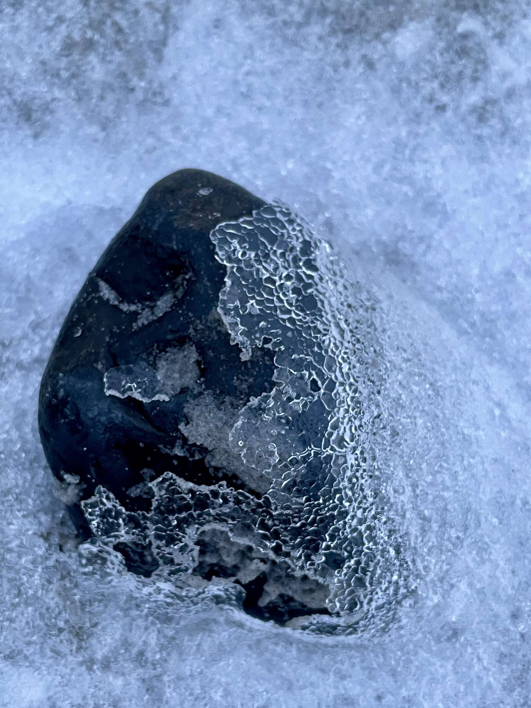 Ich hatte mir vorgenommen, nichts zu dokumentieren, weil digital detox und so. Und dann stehe ich doch am Strand, mit klammen Fingern, der Akku bricht ständig zusammen, so kalt ist es, und schaue auf Eisränder, gefrorenen Tang, eingeschlossene Muscheln – und fotografiere. Und am Ende kann man sogar ein paar Schritte auf die Ostsee wagen.
