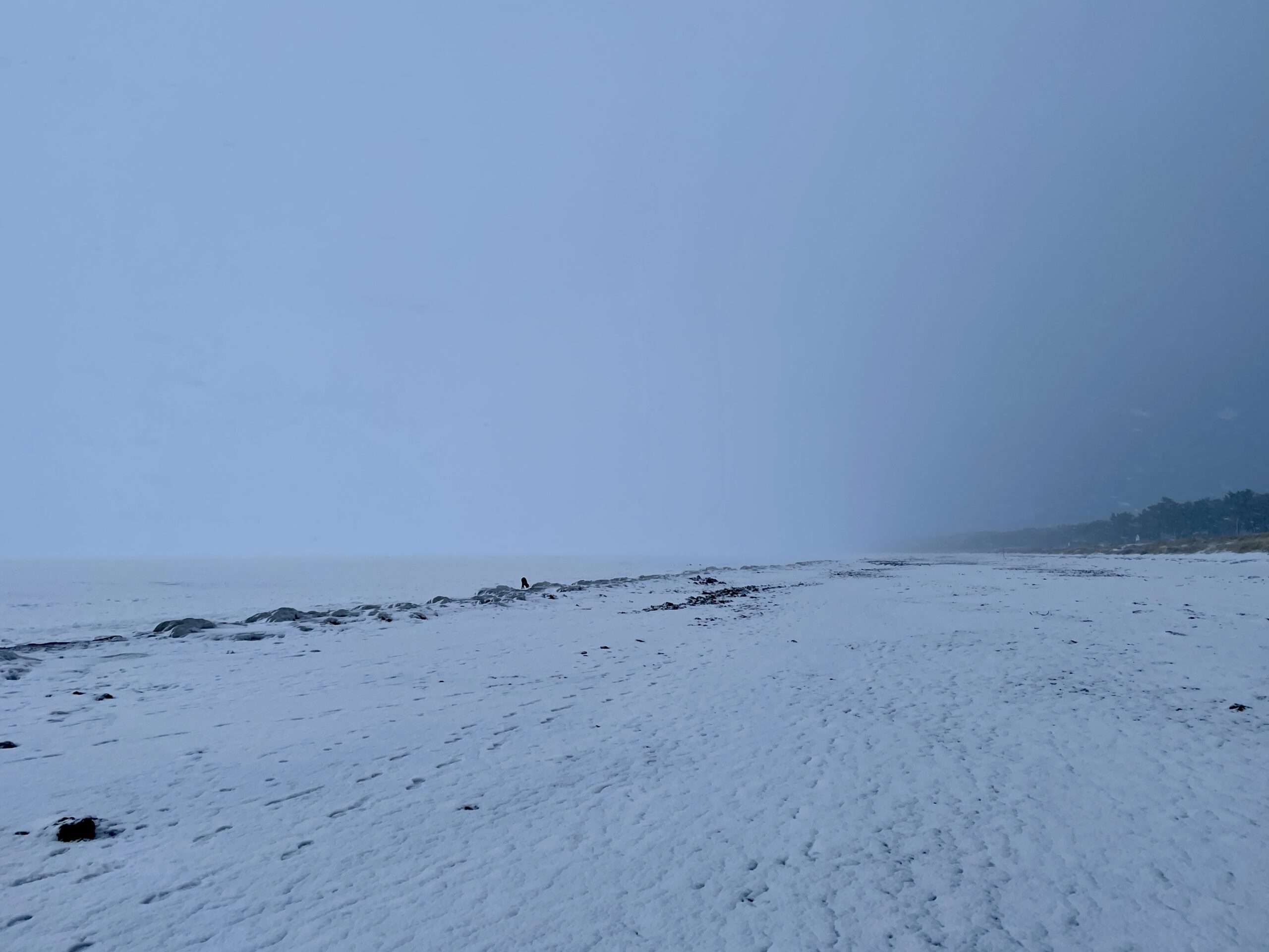 Der erste Gang wie immer morgens mit den Hunden ans Wasser. Der Wind ist noch da. Aber wo ist der Ton hin? Erstaunlich still ist es. Und: Wer hat Schnee aufs Wasser gelegt? Das Slusheis ist da. Es wabert träge unmittelbar am Strand hinter den Eiswülsten.