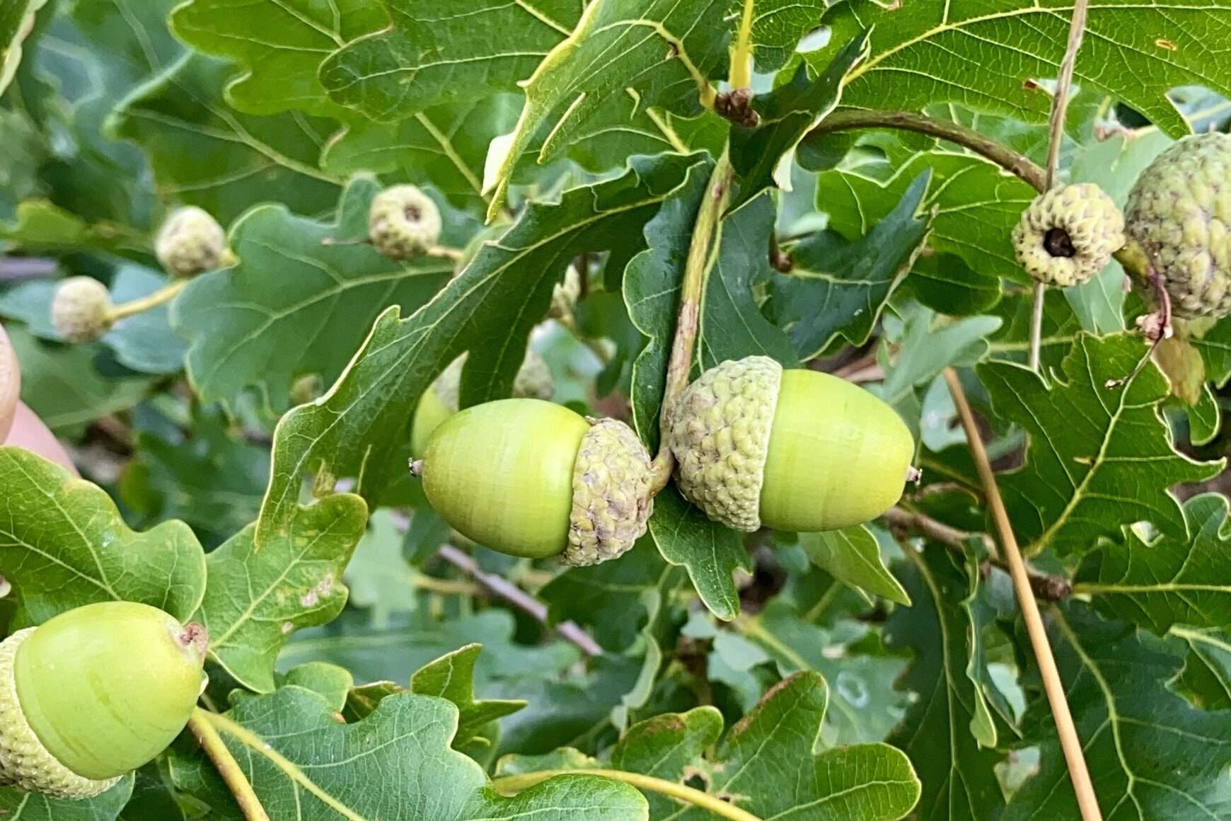 Die Eicheln sind nun gut zu erkennen, auch wenn sie noch unreif sind. Ein Zeichen dafür, dass der Baum in seine Samenbildungsphase geht.