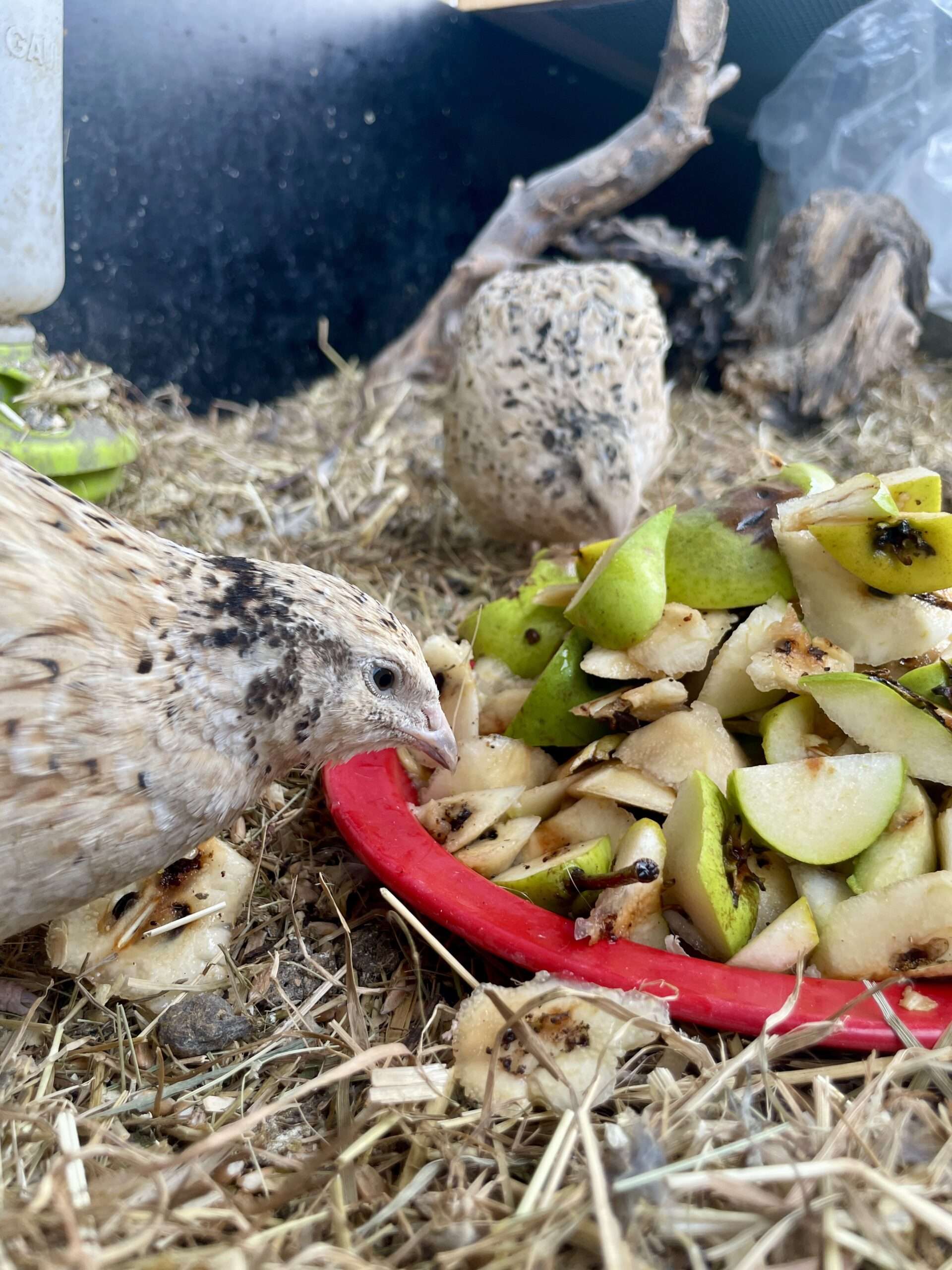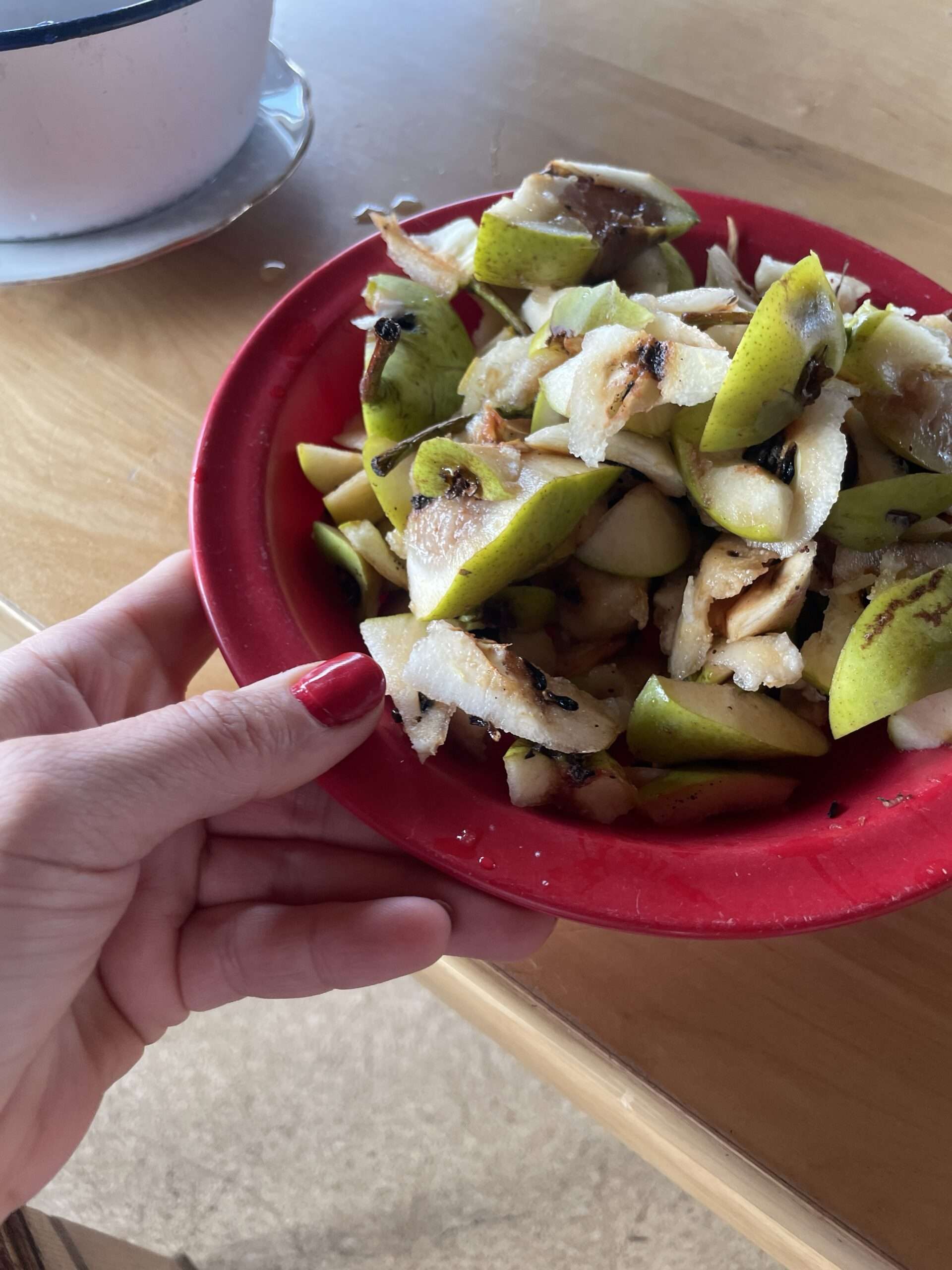 Kompott mache ich dieses Jahr nicht, einfach, weil ich keine Lust habe, Birnen zu schälen. Aber das Schöne ist: Es bleibt nichts übrig, also fast nichts Alles, was nach dem Passieren in der Flotten Lotte übrig bleibt, kommt auf den Kompost oder zu den Tieren. Die Wachteln naschen sehr gerne davon!