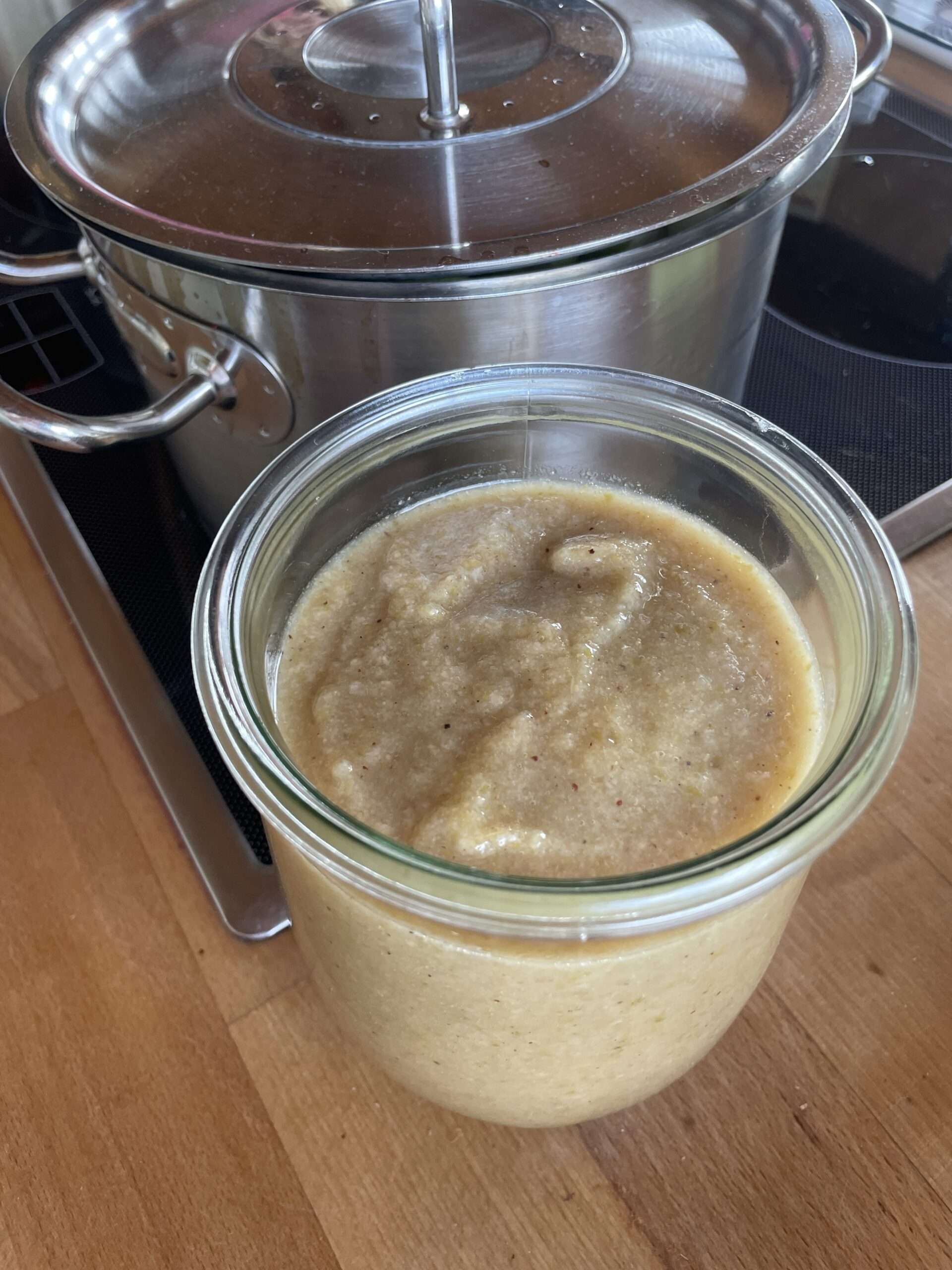 - Das Mus sofort in sterile Weckgläser (0,5–1 l) füllen, im Kühlschrank zwischenlagern und danach im Wecktopf einkochen: