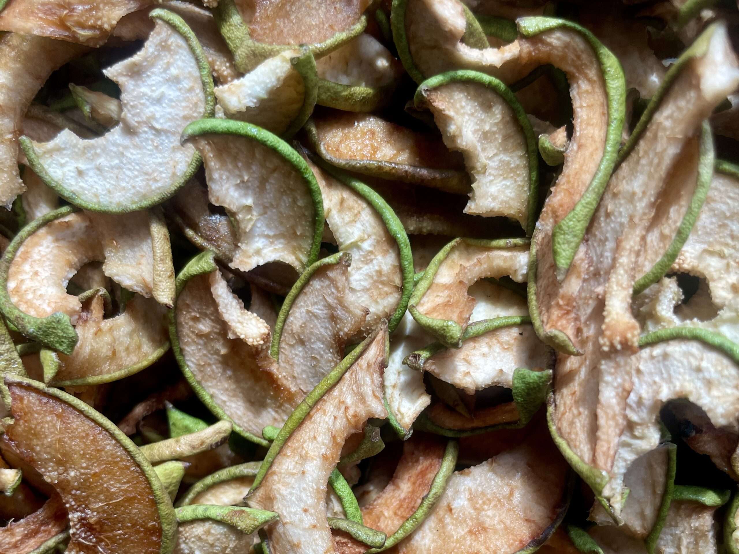 Bei der Verarbeitung kann während des Spiralschneidens das Obst geschält werden – oder auch nicht. Ich lasse die Schale immer dran, so schmeckt das Trockenobst einfach aromatischer… auch, wenn die Schale fester trocknet als das Fruchtfleisch.